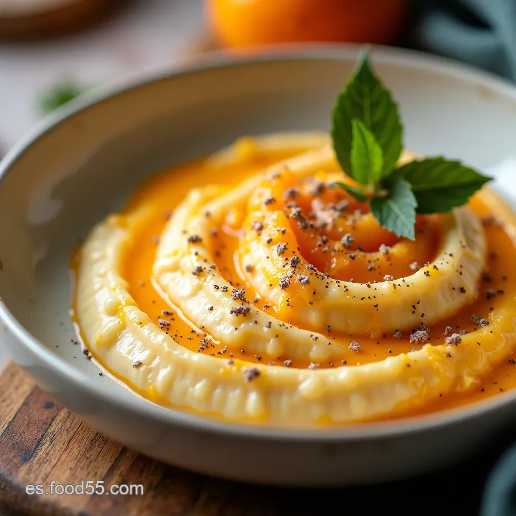 La decoración transforma el plato. Un chorrito de aceite de oliva virgen extra justo antes de servir le da brillo y un toque afrutado final. Unas semillas de calabaza tostadas aportan un crujido delicioso en contraste con la suavidad del puré.