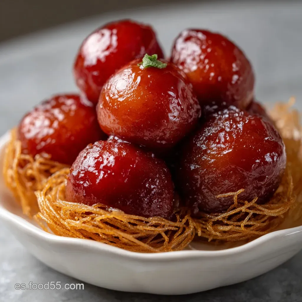 - El Baño de Sabor: Vierte una cucharada de almíbar caliente sobre cada Jamun in Kunafa Nests | A fusion of Indian and Middle Eastern flavours . Deja que reposen 30 minutes para que absorban todo.